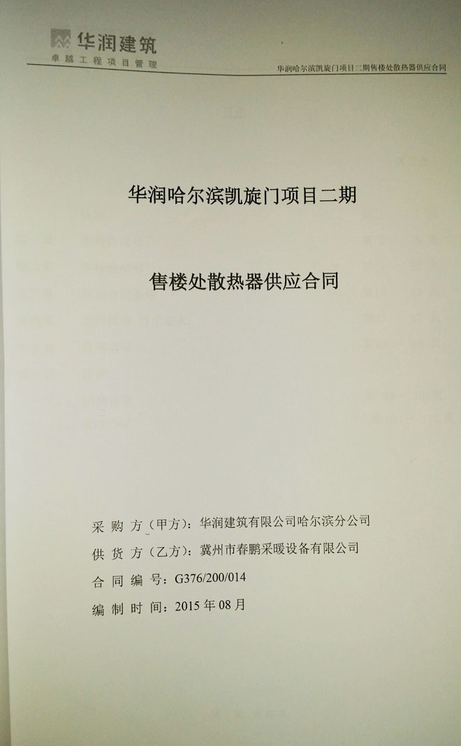 熱烈慶祝春鵬采暖和華潤建筑有限公司合作成功,河北冀州暖氣片生產(chǎn)廠家首選冀州春鵬,春鵬是2004年建成的冀州市春鵬散熱器廠,經(jīng)過十余年的發(fā)展,現(xiàn)在是冀州市春鵬采暖設(shè)備有限公司。春鵬提供銅鋁暖氣片,鋼鋁暖氣片,內(nèi)腔無砂灰鑄鐵暖氣片、鋼制翅片管、銅鋁復(fù)合、鋼鋁復(fù)合、衛(wèi)浴鋼制柱型及地暖等百余種散熱器,銷售專線:133-1308-1167。